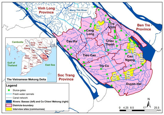 Location of research sites in Tra Vinh Province, Vietnamese Mekong Delta.