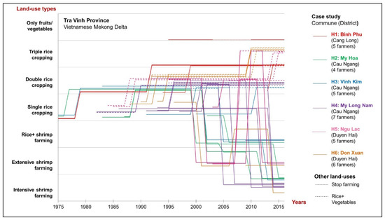 Pathways of land-use change and path dependencies [25,38] were shaped by the communal and spatial effects of the specific agro-hydrological conditions created and entered into at each step. This was most pronounced in An Giang Province [26], where the shift from single to double and to triple rice cropping had to be made communally to enable hydraulic infrastructure, such as diked polders, to be built and managed at the appropriate scale. The uniformity of land-use change was further reinforced by the paddy rice environment, in which a shift to vegetables was extremely difficult. In Tra Vinh Province, in contrast, a shift from rice to shrimp farming could be initiated at the individual farm level as long as saline water was proximate, enabling more diversity in the change pathway. Once started, however, salinity affected neighboring rice fields, drawing them into the salinity pathway as well.
