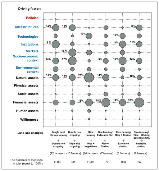 Change pathways involving shrimp production were diverse. Depending on their natural and financial assets, some farmers reverted back to rice or chose to upgrade to more intensive shrimp farming. We found intensive shrimp farming being increasingly practiced inside the South Mang Thit infrastructure, despite efforts of many farmers and communes to maintain freshwater agriculture within the protected area. Most of the interviewed shrimp farmers admitted they had switched to intensive shrimp farming in the hope of earning much greater profits than in other land uses. Yet, there were also farmers who said they had moved to intensive shrimp farming reluctantly after an unsuccessful extensive shrimp operation or mixed rice–shrimp enterprise. Moreover, salinized and polluted water from surrounding shrimp farms made some lands unsuitable for rice farming. However, intensive shrimp required good infrastructure, particularly a strong and stable electricity source, because pumps and oxygen generators were a prerequisite for dense stocking. In addition, farmers had to obtain loans from banks, supply agents, or even the black market to purchase breeding stock, medicines, and feeds. Meanwhile, the shrimp market was precarious and insecure. Though shrimp could be very profitable, failure due to disease was a constant worry. Farmers mentioned the heavy burden of the accumulated debts to suppliers, saying they hoped only to be solvent, notwithstanding the potentially high returns from intensive shrimp cultivation. The main drivers in this land-use change path can be summarized as financial assets (20%), infrastructure (12%), socio-economic context (12%), natural assets (10%), and technologies (9%) (Figure 3).
