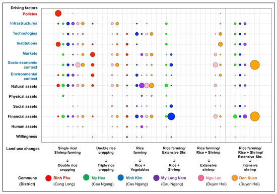 The multi-scale drivers of land-use change in the salinity intrusion zone of the Vietnamese Mekong Delta from 1975 to 2016. The sizes of the circles represent the frequency with which interviewed farmers mentioned the driver. The color of the circles represents the commune (See Appendix A, Table A3).