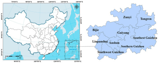 Guizhou Province is located in Southwest China (103°36′–109°35′ E, 24°37′–29°13′ N), adjacent to Chongqing, Sichuan, Hunan, Yunnan, and Guangxi. Guizhou Province is in charge of three autonomous prefectures as well as six prefecture-level cities. It serves as the transportation hub for the southwest region and an important part of the Yangtze River Economic Belt [23]. Its total area is 176,200 km2, of which more than 50% is covered by forest, and the majority of the terrain is plateaus and mountains. With rapid changes in patterns of land use and close regional economic ties, Guizhou Province is undergoing a period of rapid urbanization and industrialization. The average regional GDP experienced strong growth from 2009 to 2019, growing annually to CNY 1676.93 billion. The scope and geographical location of the research area are shown in Figure 1.