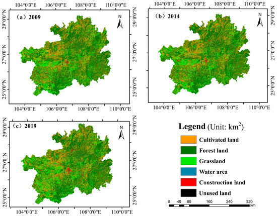 Based on the findings presented in Table 3 and Figure 2, it can be inferred that forest land is the most extensive land type in Guizhou Province, encompassing over 50% of the total land area. This can be attributed to the predominantly mountainous and hilly terrain of the region, which is characteristic of the geological mountainous area in the karst region [27,28]. In the past decade, both forest land and grassland exhibited a declining trend, with forest land experiencing a significant reduction of 2413.43 km2. As the second largest land type, the proportion of cultivated land in the land area showed a decreasing trend year-over-year. This was because the rapid rise in industrialization caused cultivable land to be increasingly taken over by construction land. Additionally, there has been a positive trend in recent years in the reversal of farms to grassland. According to the data, there was a general growth in the grassland area of Guizhou Province, which increased from 29,586.7 km2 in 2009 to 31,327.96 km2 in 2019. Significant change was seen in construction land, with an area change rate of 146.90% and a total increase of 1284.71 km2. Despite the tiny amount of construction land, the intensity of the land use was considerable. The population was constantly growing against a societal backdrop of improving living conditions. As more rural residents relocated to cities, there was an increase in demand for development land. Although the proportion was very small and had little impact on the overall land-use structure, there was an increase in both the water area and unused land area.