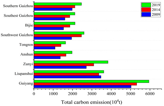 Changes in carbon emissions in various cities of Guizhou Province from 2009 to 2019.