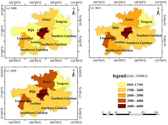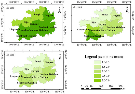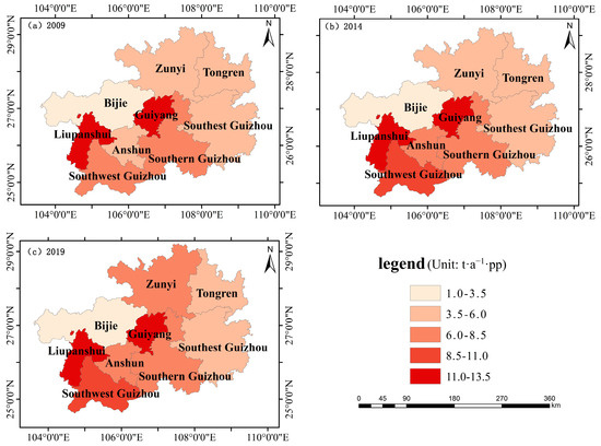 Based on the population data of the Guizhou Statistical Yearbook (2009–2019), the carbon emissions per capita in the cities of Guizhou Province were calculated (Table 7). The spatial distribution of carbon emissions per capita was created using the computed results (Figure 6).