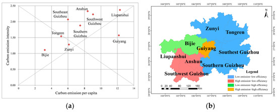 The emissions efficiency of Guizhou Province was divided into four categories via a cluster analysis based on the distribution characteristics of the scatter diagram using ArcGIS10.3 software: high emissions–high efficiency, high emissions–low efficiency, low emissions–high efficiency, and low emissions–low efficiency. Guiyang was the only city with high emissions–high efficiency, and Liupanshui, Anshun, and Qianxinan Autonomous Prefecture had high emissions–low efficiency. The low emissions–low efficiency areas included Zunyi, Tongren, Qiandongnan Autonomous Prefecture, and Qiannan Autonomous Prefecture, and Bijie was the only low emissions–high efficiency area. As the capital city of Guizhou Province, Guiyang has a high population density and a relatively high level of economic development, resulting in a high energy demand. There are many mountains and hills in Bijie, and the ecosystem is relatively intact compared with other areas. Additionally, Bijie has a high capability for absorbing carbon and a low population density. Zunyi, Tongren, Qiandongnan Autonomous Prefecture, and Qiannan Autonomous Prefecture lag behind the other cities in terms of economic development, and their secondary and tertiary industries are not particularly advanced, making them low emissions–low efficiency cities. As can be seen from Figure 7, the spatial distribution of carbon emissions per capita and carbon emissions intensity in Guizhou Province also presents certain agglomeration characteristics.