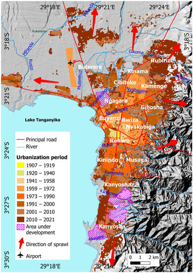 Located in the western branch of the East African Rift, the choice of Bujumbura as a settlement was linked to the presence of Lake Tanganyika (Figure 1; [76]). Founded by the Germans in 1897 and developed by the Belgians from 1916 to 1962, Bujumbura has expanded considerably in space after Burundi’s independence [77]. Its extension, long dictated by natural constraints (north-south direction), now involves the steep slopes to the east and the shoreline of Tanganyika Lake to the west, originally reserved for woodlands and recreation.