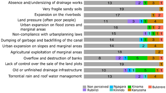 The level of perception of the causes varies depending on the municipality (Figure 7). For the northwestern municipalities (Buterere and Kinama), the population’s perception is more oriented toward the inappropriate rainwater drainage system and the undersized infrastructure. For example, as emphasized by the participants in the focus group N°4: ‘the problem is that they are building pipes upstream that discharge the water into the Kinyankonge river, forgetting that the downstream part is inhabited’. Similarly, ‘… the branch of the Kinyankonge that passes next to the Islamic High School overflows and floods the Mutakura-Buterere road because of the section of the pipes that cannot evacuate the entire quantity of water…’. This issue was also mentioned by other focus groups from the north of the city. Another case is given by the participants in the focus group N°3, who reveal that ‘[…] in 2015, the unfinished construction of the Gasenyi river canal downstream of the Carama neighborhood and the Kidumbugwe river canal were for us and the inhabitants of Buterere synonymous with ordeal, while it was a solution for the inhabitants of the parts where the canals are built and completed. Often, we are flooded when it hasn’t even rained in our neighborhood’.