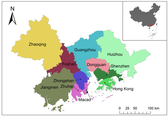 The Guangdong–Hong Kong–Macao Greater Bay Area (GBA) is situated in the Pearl River Delta, within the southeast coastal region of China (Figure 1). It encompasses nine cities within the Pearl River Delta urban agglomeration, namely Guangzhou, Shenzhen, Foshan, Dongguan, Huizhou, Zhongshan, Zhuhai, Zhaoqing, and Jiangmen, along with the two special administrative regions of Hong Kong and Macao. Covering a total area of 56,000 km2, the GBA accommodates a population of over 86.0 million people engaged in various livelihoods and economic activities, and it contributed more than USD 166.68 billion to the GDP in 2020 (https://www.bayarea.gov.hk/ (accessed on 7 August 2023)). Functioning as a pivotal economic engine, the GBA, despite occupying only 5.8% of China’s land area, constitutes a significant share of the nation’s gross domestic product, accounting for 11.4% (https://www.ndrc.gov.cn/ (accessed on 7 August 2023)). Recognizing the strategic importance of regional tourism cooperation, a key current objective is to develop the GBA into an internationally recognized premier bay area destination for tourism [18]. Based on official documents, the GBA is envisioned as a high-quality living, employment, and tourism hub. Its thriving tourism sector is vital for promoting overall economic transformation, enhancing comprehensive competitiveness, and establishing a strong brand image for the GBA city cluster (https://www.gov.cn/ (accessed on 7 August 2023)). As a distinctive regional economy, the bay area’s economy holds immense significance and exhibits substantial development potential [18].