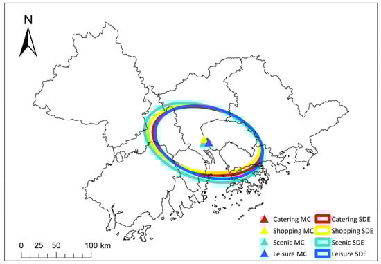 The center of the standard deviation ellipse for tourism in the Guangdong–Hong Kong–Macao Greater Bay Area primarily lies to the right of the Nansha Wetland in Guangzhou, exhibiting a noticeable trend of southeastward distribution. The aggregation area follows a rough “southeast-northwest” orientation, covering most regions within Guangdong, Dongguan, Foshan, Shenzhen, Zhuhai, Hong Kong, and Macao.