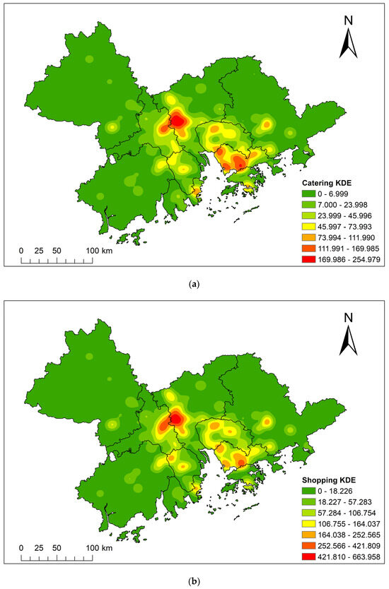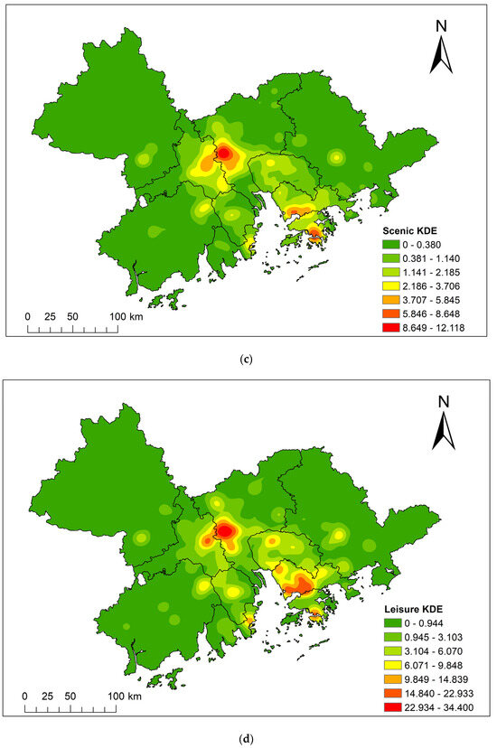 In order to identify the specific area of agglomeration of tourism services in the GBA, the degree of spatial agglomeration of different types of tourism POI was examined using kernel density analysis (see Figure 3).