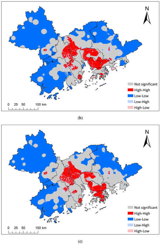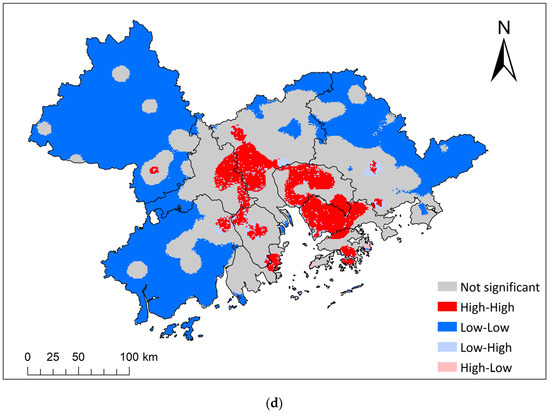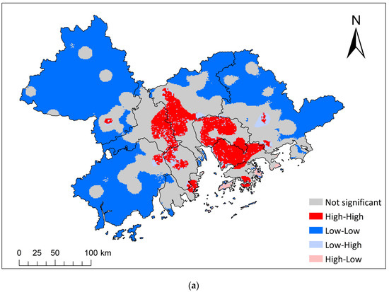 Like catering services, other tourism service categories of shopping, scenic spots, leisure, and sports services share similar characteristics of spatial correlation. However, in the periphery of the GBA, these services belong to low–low aggregation, with rare instances of other aggregation patterns observed. Unlike the kernel density estimation map, the high–high aggregation areas extend across municipal boundaries in the economic field, indicating significant development potential in the Pearl River Delta region. The non-significant areas surround the core high–high aggregation areas, indicating that these types of areas are discrete, with no obvious spatial bivariate correlation. They are randomly distributed, and there is a random pattern of aggregation of high and low values within each area, which does not effectively indicate the direction of development.