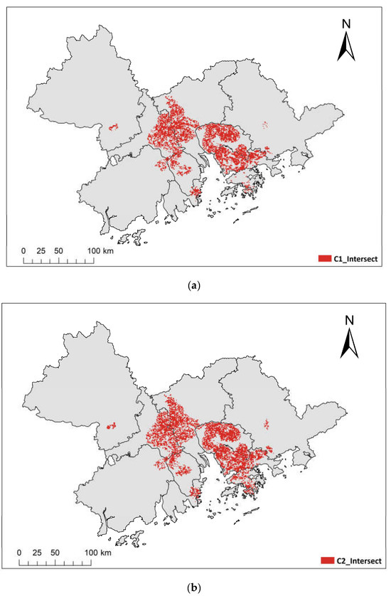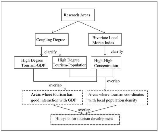 We also classified the areas in which tourism services had a high degree of coupling with GDP. It can be seen that the high-value areas with a coupling between GDP and tourism services are principally located in Guangzhou, Foshan, Zhuhai, Dongguan, and Shenzhen, indicating that tourism and GDP are highly dependent on each other. However, areas with a high degree of coupling do not necessarily indicate that tourism services can be a driving force of GDP; as we discussed before, tourism economy may be exclusive with other economic sectors on a scale of 1 km2. Yet, if we combine and overlap the areas with high–high aggregation measured using the local Moran’s index and the areas with a high coupling degree between tourism services and GDP, we can clearly identify the areas where tourism services are not only highly developed but also have a positive interaction with local GDP (see Figure 6a,b). We also offer the methodological process for identifying hotspots for tourism development in Figure 7. In this sense, such areas can be considered as suitable for the development of tourism because tourism can promote GDP growth, bring higher flows of people, and, therefore, create “spillover efforts” on the local economy. This growth relationship is bidirectional because such areas are both highly coupled and highly interactive and, therefore, are important areas for urban and tourism planning.