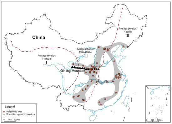 Possible migration and dispersal corridors of early hominins based on the distribution of the archaeological sites from Early to Middle Pleistocene in China. (The Paleolithic sites of Early and Middle Pleistocene are cited from Lu et al. (2021) [20]).
