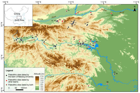 These loess–paleosol sequences are important carriers for recording the changes in the Paleoenvironment [58], and they have retained rich hominin fossils and Paleolithic cultural remains. The study of loess is closely linked with Paleolithic archaeology, which can provide environmental background and chronological sequence for investigating hominin occupations and evolutions [59,60]. The research progress of the 55 hominin fossils and Paleolithic sites that have independent dating data in the QMR and surrounding areas are summarized in this paper (The distribution of these 55 sites is shown in Figure 2), and among them, 44 sites were systematically dated by our team, and 15 sites were dated by other teams. Most of these 55 hominin fossils and Paleolithic sites were found in loess deposits developed in the northern, southern, and eastern QMR, and these lithic culture remains are densely distributed in the watersheds of the Bahe River, Hanjiang River and South Luohe River.