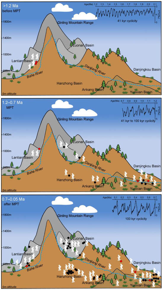Hominin occupation and diffusion in the QMR were basically continuous in glacial and interglacial scales during the Pleistocene, but there were differences in the northern, eastern, and southern QMR. From Figure 3, it can be preliminarily seen that the human occupation in the eastern and southern QMR were significantly later than that in the northern QMR, and it seems to be a certain correlation with the “Mid-Pleistocene transition” (MPT), which was an event in which the global climate underwent a significant change and is generally believed to have occurred between 1.2 and 0.7 Ma [112,113,114]. As a result, we cut across the Qinling Mountains along the Bahe River valley and Danjing River valley, and have marked relevant dated hominin fossils and Paleolithic sites as the time periods of >1.2 Ma (before MPT), 1.2–0.7 Ma (MPT), and 0.7–0.05 Ma (after MPT) (Figure 4), and we have tried to explore the spatiotemporal characteristics and the mechanism of the early hominin settlement, migration, and dispersal in QMR.