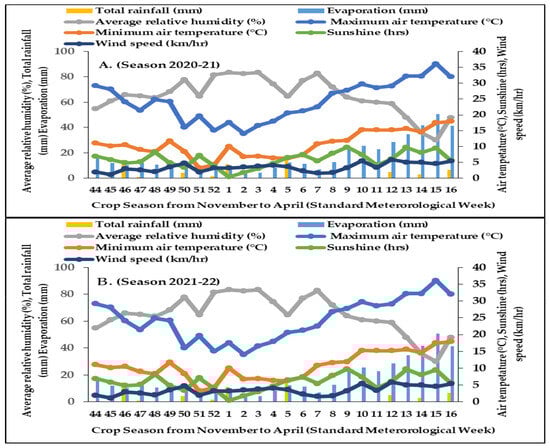 Graphical representation of crop season from November to April according to weekly meteorological data during wheat crop seasons of 2020–21 (A) and 2021–22 (B).