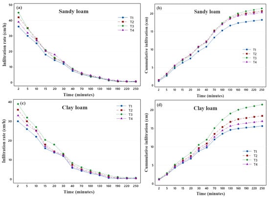 Infiltration rates and cumulative infiltration in sandy loam (a,b) and clay loam (c,d) soils as affected by tillage and residue management options.