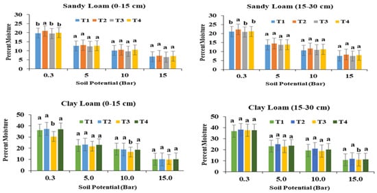 As seen in Figure 3 for the sandy loam soil, the soil moisture content fluctuated significantly under various tillage and residue management options. The residue retained treatment (T2) had higher moisture content at a depth of 0–15 cm than the straw-removed treatment. The soil moisture retention was highest in the T2 treatment, followed by the T4 treatment. In comparison to residue removal or burning, Kushwaha et al. [86] and Bhagat et al. [87] showed a significant increase in the soil water content after straw incorporation. Due to the depletion of residue-derived organic materials, a deterioration in the soil structure, and high losses by evaporation, the conventional tillage after removing the rice straw (T1) at a depth of 0–15 cm from 0.1 to 15 bar matric potential showed the least significant soil moisture content [40].