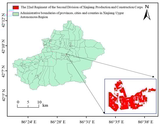 The 22nd Regiment (86°22′–86°48′ N, 42°05′–42°15′ E, a.s.l. 1060–1921 m) is located in the Kaidu River Basin in Xinjiang Uygur Autonomous Region in Central Eurasia (Figure 1). This area has a temperate continental climate, with four distinct seasons, long sunshine duration, large day/night temperature difference, and dry air [31]. The annual average temperature was 8.8 °C, and the average annual precipitation was 59.2 mm. Crops are grown under drip irrigation. The terrain is inclined from northwest to southeast [32]. Soil texture is mainly heavy loam.