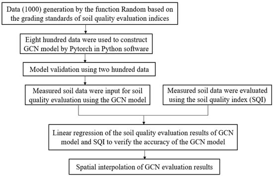 Before modeling, soils were graded according to the Grading Standard of the Second National Soil Census in China and the Soil Evaluation Grades of Xinjiang. Because the increase in soil salinity and heavy metal contents will reduce the soil productivity, the soil salinity and heavy metals were evaluated together. To maintain the consistency of the grades of the two grading standards, the soil evaluation grades were regraded (Table 3). Then, the soil quality evaluation model was constructed (Figure 3). (1) According to the soil grading standards, 1000 data (200 per grade) were randomly generated in Python version 3.8. (2) Eighty percent of the data were randomly selected for network training based on GCN, and the rest of the data were used as the validation set for model validation. (3) The measured soil data (soil nutrients, soil salinity, and heavy metals) (Table 3) were input into the GCN model, and then the soil grading results (I, II, III, IV, V) were automatically output. (4) The soil grading results by SQI were linearly fitted to the soil grading results by GCN to evaluate the model accuracy, and then the spatial interpolation of the evaluation results by GCN was performed.