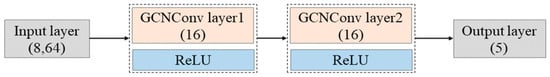 The GCN structure constructed in this study is shown in Figure 2. The number of nodes in the graph convolution network was 16, the activation layer adopted ReLU, and the one-dimensional data (1 × 8) were converted into a graph of (8, 64) during data input. During model training, Adam was used as the optimizer, the cross-entropy loss was used as the loss function, the learning rate was 0.005, and the number of iterations was 300. The optimal number of layers was determined according to the sparsity of the neighbor node matrix in the graph. When the sparsity is low, then oversmoothing will occur, leading to a low model accuracy when using multiple layers [43]. Additionally, for a simple node classification task, the discrimination of nodes will become worse after using multi-layer GCN, and their vectors tend to be consistent, leading to a series of problems such as gradient disappearance, oversmoothing, and overfitting that obstruct the learning task. In this study, a total of 500 iterations and 5 layers were tested, and it was found that when the number of iterations and layers were 300 and 2, the model accuracy was optimal.