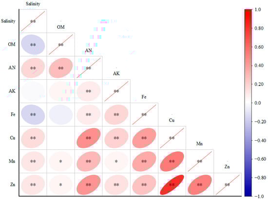 Pearson correlation analysis showed (Figure 4) that soil salinity was negatively correlated with SOM and Fe (p < 0.01), and positively correlated with the indices except for AK, OM, and Fe (p < 0.05). SOM was positively correlated with AN (p < 0.01), Mn (p < 0.05), and Zn (p < 0.05). AN was positively correlated with all indices (p < 0.01). AK was positively correlated with Fe (p < 0.01), Cu (p < 0.01), Zn (p < 0.01), and Mn (p < 0.05). Fe was negatively correlated with salinity (p < 0.01) and SOM (p > 0.05), and positively correlated with other indices (p < 0.01). Cu was positively correlated with all indices except SOM (p < 0.01). Mn was positively correlated with SOM (p < 0.05), AK (p < 0.05), and other indices (p < 0.01). Zn was positively correlated with SOM (p < 0.05) and negatively correlated with other indices (p < 0.01). There was a positive correlation between soil heavy metals (p < 0.01).