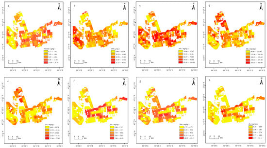 Spatial distribution of the values of soil evaluation indices: (a) salinity spatial distribution map; (b) OM spatial distribution map; (c) AN spatial distribution map; (d) AK spatial distribution map; (e) Fe spatial distribution map; (f) Cu spatial distribution map; (g) Mn spatial distribution map; and (h) Zn spatial distribution map).