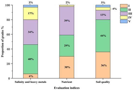 For soil salinity/heavy metals, Grade V soil samples accounted for the least (3%), Grade I soil samples accounted for 6% of the total, and Grades I and V soil samples were mainly distributed in the western and northern regions. Grade II soil samples were the most (40%), concentrated in the central region. Grade III soil samples accounted for 34%, and were dispersedly distributed in the study area. Grade IV soil samples accounted for 17%, concentrated in the western region (Figure 6 and Figure 7a).