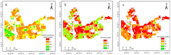 The spatial distribution of soils of different grades evaluated by the graph convolution network model: (a) spatial distribution of soil salinity and heavy metals; (b) spatial distribution of soil nutrient grades; and (c) spatial distribution of soil quality grades.