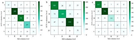 In this study, the confusion matrix was used to determine the GCN model evaluation accuracy. The confusion matrix is suitable for the statistics of data classification accuracy, and it can accurately and objectively evaluate the overall distribution and change trend of features. The confusion matrix accuracy refers to the percentage of correctly predicted samples in the total sample. The larger the element value on the diagonal on the confusion matrix, the higher the reliability of the classification results. Conversely, the larger the element value on the non-diagonal, the more serious the misclassification [44].