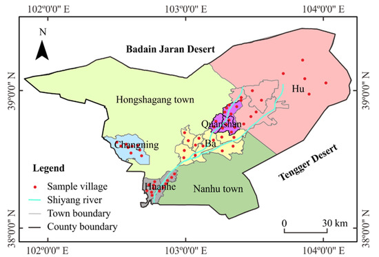 Minqin county, China was selected as the study area since it is a typical example of an arid–semi-arid agricultural area with serious shortages in farmland and water, while having a critical ecological status (Figure 1). Minqin county is located in the lower reaches of the Shiyang river in northwestern China. It is a line of defense between the Badain Jaran Desert and the Tengger Desert [37,38], which makes it an arid and semi-arid region, and it possesses a vital ecological strategic status in China. The economic development of Minqin county mainly depends on agricultural production, but farmland and water resources are scarce. Its local irrigation water mainly comes from the Shiyang river. In recent years, the runoff of the Shiyang river has decreased significantly, and its irrigation capacity has been exhausted [39]. With the increase in water consumption in agricultural production, the contradiction between planting structure and limited water resources needs to be adjusted [8]. Water crises and the weak drought environment have destroyed the oasis ecosystem. As a result, people living in the oasis need to ensure careful management of land and water resources. Otherwise, poor management could easily lead to land and water degradation [40]. Therefore, the rational utilization of agricultural resources in Minqin, especially the water resources, is critical to both agricultural development and ecological sustainability across the whole of China [41]. The issue of developing sustainable agricultural practices through improvements in agricultural resource efficiency is a big challenge faced by local policy makers. Thus, studies on the efficient utilization of agricultural resources in Minqin have great ecological significance.