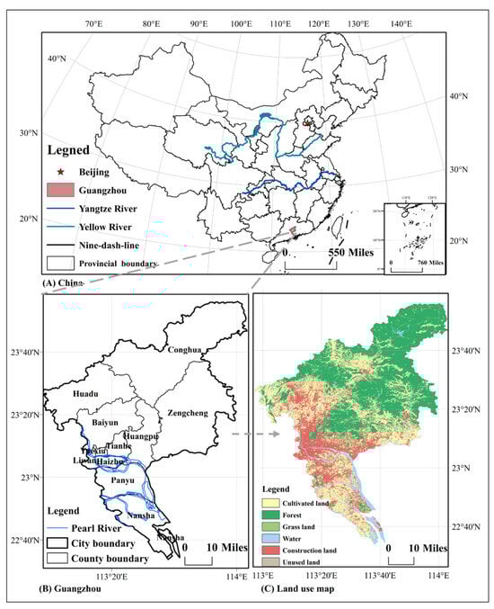 | Total area | = TA | “Guangzhou City Territorial Spatial Master Plan (2018–2035)” (http://ghzyj.gz.gov.cn/zwgk/ztzl/gtkjgh/gzxx/content/post_6484475.html (accessed on 22 June 2023)) |