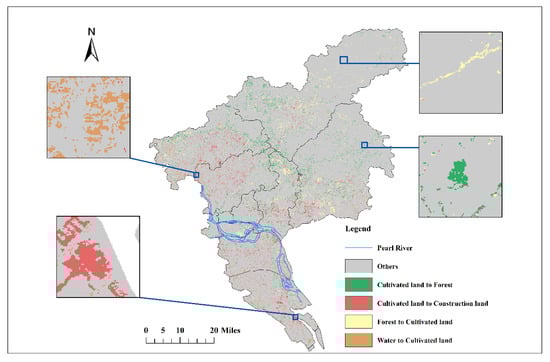 3.3. Simulated Spatial Pattern of Land Use in 2035