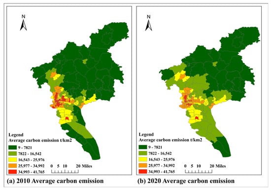 - Carbon emission coefficient of forest and grass land. These two land use types have a carbon sink capacity that is affected by a variety of factors, such as climate, vegetation, and the chemical and biological properties of the soil, which are generally stable and do not undergo substantial changes in the short term [35,36]. Thus, the carbon emission coefficients of forest and grass land obtained from the existing studies are −57.8 and −2.1 t/km2, respectively [37].