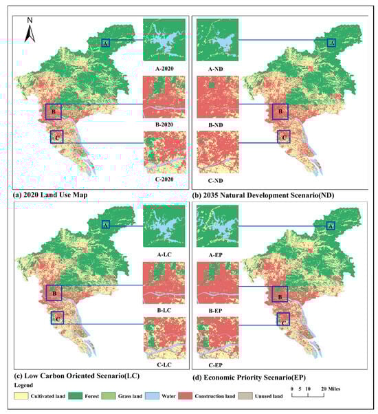 - Natural development scenario. This scenario does not consider the other factors’ effects of land use type transformation. The natural development scenario is the control group for other scenarios—it just obeys the historical pattern of land use change from 2005 to 2020. The land use demands under the natural development scenario in 2035 are predicted by the Markov Chain model [44];
