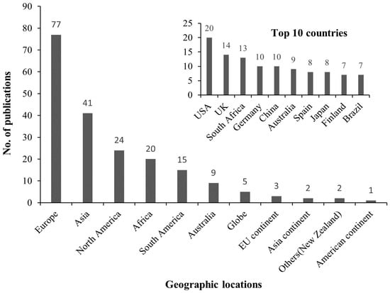 The reviewed studies predominantly focused on Europe, with 77 studies, followed by Asia and North America, with 41 and 24 studies, respectively. Africa contributed 20 studies, with the majority of them concentrated in South Africa, totaling 13 studies. Figure 2 further highlights the top 10 countries, with the USA leading the list with 20 studies. The UK was the second-highest-ranking country, with 14 studies, and south Africa ranked third, with 13 studies. Additionally, five papers encompassed cross-studies conducted in various countries and at the global level.