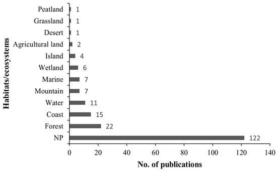 With the aim of characterizing NP classes, this study included all the scopes mentioned above and proposed that NP types include the follow: (1) specific NP types, such as forests, coasts, wetlands, or mountains, which were categorized separately and recorded accordingly; and (2) “national parks”, which was recorded as an independent type when studies did not specifically target specific habitats but instead considered the national park as a whole, as exemplified by Nahuelhual et al. [54].