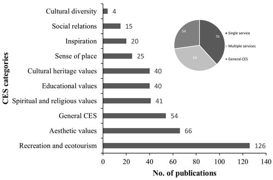 Figure 4 shows that 76 studies were exclusively dedicated to a single service, while 69 studies concurrently explored multiple categories of cultural services. Furthermore, 54 studies comprehensively investigated cultural services as a whole. Figure 4 also illustrates that recreation and ecotourism held the foremost position with 126 studies, followed by aesthetic values with 66 studies, spiritual and religious values with 41 studies, educational values with 40 studies, and cultural heritage values with 40 studies. In contrast, cultural diversity, social relations, and inspiration received comparatively less attention, with 4, 15, and 20 studies, respectively.