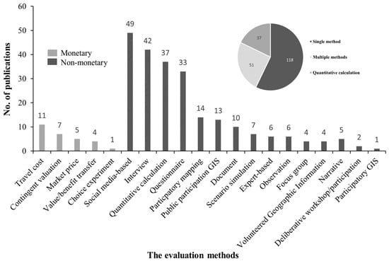 This study systematically reviewed the methodologies employed for assessing CES in each respective paper. Drawing upon existing CES evaluation studies by Christie et al. [37], Hirons et al. [38], and Cheng et al. [30], etc., the CES evaluation methods were systematically categorized into monetary methods and non-monetary methods. Subsequently, an iterative approach was employed to meticulously evaluate the methods utilized within each of the reviewed papers and obtain a final set of methods. Ultimately, the methods employed in the reviewed papers were counted. If more than one method was used in one paper, they were recorded.