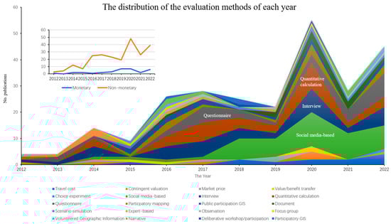 Additionally, Figure 6 illustrates the distribution of evaluation methods for each year. The majority of studies utilized non-monetary methods, and their usage steadily increased in NP studies, with the exception of a significant decline in the year 2021. The use of interviews and questionnaires has consistently risen over time, while social-media-based methods have gained increasing attention and have recently ranked first in popularity.
