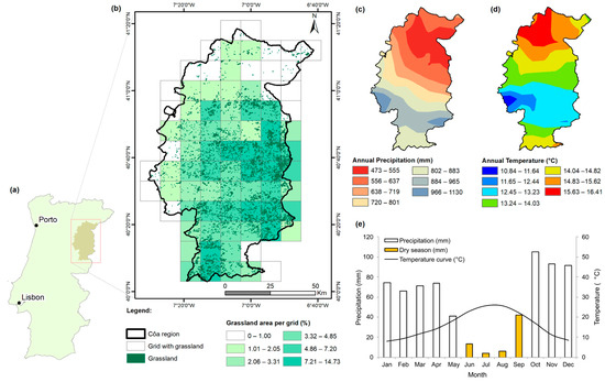 Study area presentation: (a) Location of the study area in the Côa Region, northeastern Portugal. (b) Spatial distribution of the consolidated pasture polygons used in the temporal variability analysis, with the representativeness of the pastures (in % of the land cover area) within each grid box (10 × 10 km) and definition of the grids used in this study. Spatial patterns of (c) total annual precipitation and (d) mean annual temperature of the Côa region, determined from historical values for the period 2000–2021. (e) Gaussen ombrothermic diagram, with monthly precipitation totals (in mm, dry months in orange bars) and mean temperatures (in °C) for the period 2000–2021.