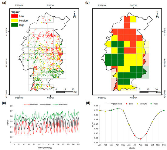 Methodological approach: (a) Mean monthly NDVI value of the tile for each polygon of consolidated pasture. (b) Adjustment of the spatial resolution of the mean NDVI values for consolidated grasslands (250 metres to 10 × 10 km). (c) Temporal variability of the NDVI for the whole Côa region, with the minimum, mean, and maximum values plotted. (d) The vigour curve of consolidated pasture in the Côa region. Figures (a,b,d) refer to the average NDVI value for all study periods (2000 to 2021).