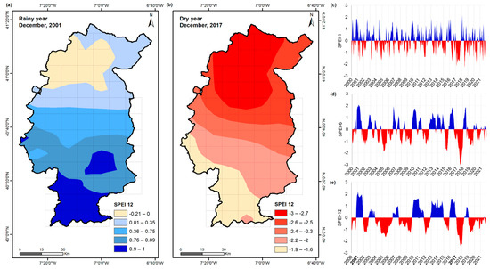 Visualisation of the SPEI (Standardised Precipitation-Evapotranspiration Index) for the Côa region: (a) Spatial distribution of the SPEI-12 for 2001, a very rainy year. (b) Spatial distribution of the SPEI-12 for the year 2017, a very dry year. (c) SPEI-1, (d) SPEI-6 and (e) SPEI-12 time series for the period 2000–2021.
