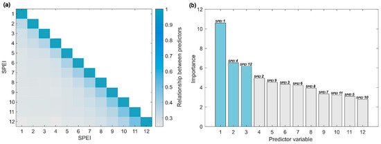 A preliminary model considered all the predictor variables and obtained R2 = 0.93. The consistency of the information presented by the model was proven by the low correlation among predictors (Figure 4a), where it was possible to observe a low relationship between the predictor variables of short (SPEI-1, SPEI-2, and SPEI-3) and a long period (SPEI-10, SPEI-11, and SPE-12). The most important features were SPEI-1, SPEI-4, and SPEI-12 (Figure 4b). A new final model was produced using only these predictors, achieving a high determination coefficient, explaining 76% of the NDVI variability.