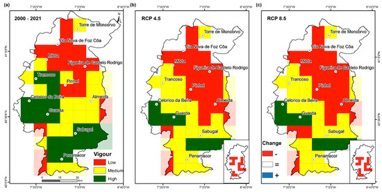 Projections for the future (2071–2100) show similar spatial patterns to the recent past period but with a noticeable decreasing trend in vigour. These projections show a southward expansion of the lower vigour areas towards the central-eastern Côa. Medium vigour areas are expected to expand, especially in the southwest or northwest, due to the decrease of high vigour areas. Particularly, the Trancoso region (west) and Penamacor (south), which in the recent past were considered high-vigour areas, are projected to shift to the medium vigour class (Figure 5b,c). To the south of the Guarda municipality, the reduction in vigour is projected to be noticeable, with stronger impacts in RCP8.5 (Figure 5c). In fact, in the more severe scenario, the effects of climate change on grasslands will be generally more visible (Figure S1), with a more pronounced reduction in future NDVI. Nonetheless, the vigour classes (low, medium, and high) are projected to remain similar under both future scenarios (not sufficient to change the vigour class), with the exception of the areas south of Guarda (Figure 5b,c). The areas that are expected to still have high vigour for pastures will be restricted to some parts of Guarda, Celorico da Beira, and some areas north of Penamacor. Nonetheless, the strongest reductions in NDVI are indeed expected for these areas (Figure S1), which also correspond to higher elevations. It should also be noticed that in the current low vigour areas (north), a slight increase in NDVI levels is expected (Figure S1), although also not resulting in a class shift (Figure 5b,c).