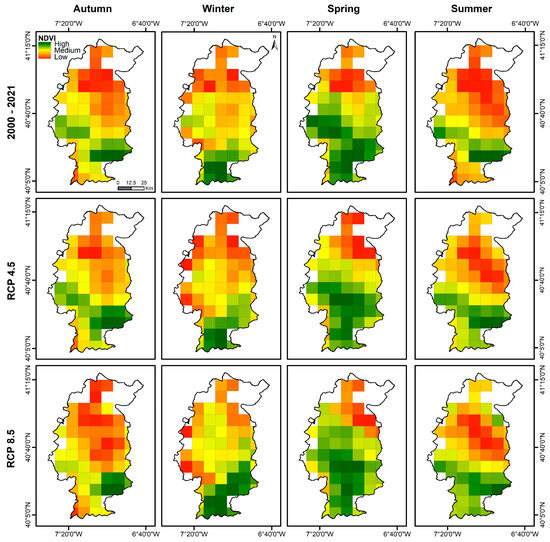 Grassland vigour in the Côa region, according to seasons for the recent past dataset (2000–2021) and the RCP4.5 and RCP8.5 scenarios.