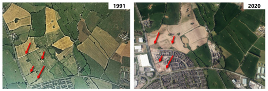Although the masterplan recommended that field patterns be “retained where possible”, no explicit mention is given to retaining or enhancing “low grade agricultural land” [38] used for arable farming; this suggests a subtle politics of displacement/eradication at work. Similarly, developers were also requested to demonstrate how “the biodiversity value of the site will be enhanced”, through the retention and enhancement (where possible) of “trees, hedgerows and ponds” [39]. Yet, while this occurred during the building phase, analysis of aerial photographs also reveals considerable removal of hedges and mature trees, despite suggestions made to “replant a wide range of species suited […] to the landscape setting”, such as “limes [that] have been used to develop this part of Stafford” [37]. Of course, the selective removal, displacement and management of existing flora and fauna is often justified on economic and practical grounds [23]. But, despite concerted efforts to conserve rural hedgerows as “icons of the English rural aesthetic” [40], together with increased awareness of hedges to improve carbon capture and halt biodiversity decline [13], this development extends a trend of tree and hedgerow removal affecting other parts of England in recent decades [17] (Figure 3).