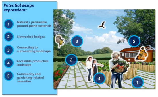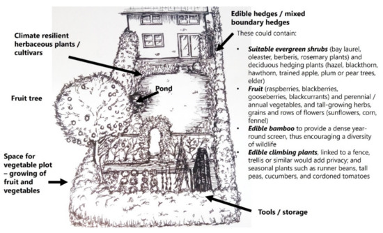 More ambitiously, it is conceivable that new developments might centre around working farms and/or inclusive local growing spaces: resilience and social cohesion are generated through communal growing, thus encouraging a sense of place [30]. With shades of those more ‘radical’ suburban ideas promulgated by certain British architects, consultant planners and professional officers for housing to be arranged around communal productive green, hedged spaces [19], the starting point here is to recognize the significance of the countryside spaces and natural systems, rather than focus on the layout of buildings, roads, and infrastructure, and the displacement or careful choreographing of protected/marketable species to align with human design ambitions. This also connects with a need to create sustainable and resilient food networks across productive residential landscapes, embedding food systems thinking into planning new and existing landscapes [14].