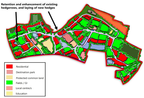 Against the wider backdrop studies that call for the testing of possible scalable ecologically connected food production spaces at the contested rural–urban fringe [14,15], Figure 7 represents a reworked example of the Marston Grange scheme. In this case, rather than focusing exclusively on developing infrastructure, buildings, roads and plots, landscape elements and biological components are fundamentally important in early design thinking for sustainable communities [9]. The overarching ambition in this is for the urban form to be structured in large part by the green (and blue) infrastructure: new hedgerows connect with existing ones, while rear garden hedges combine to create green networks. This responds to criticisms regarding the need for landscaping to respect and enhance biodiversity, connecting the spatial arrangement of new and existing landscape features with historical factors, including field boundaries and farming practices [11].