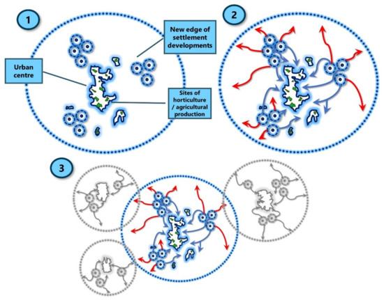 The scaling ‘up’ and ‘out’ of agricultural-led residential development. This could involve an analysis of existing urban sites capable of supporting agricultural production (1). The building of new edge-of-settlement sites (2); these hold the capacity to grow food and support the main, ‘nodal’ settlement, while foodstuffs could be ‘exported’ to nearby urban areas and beyond (2). A network of inter-connected food-growing urban areas (3).